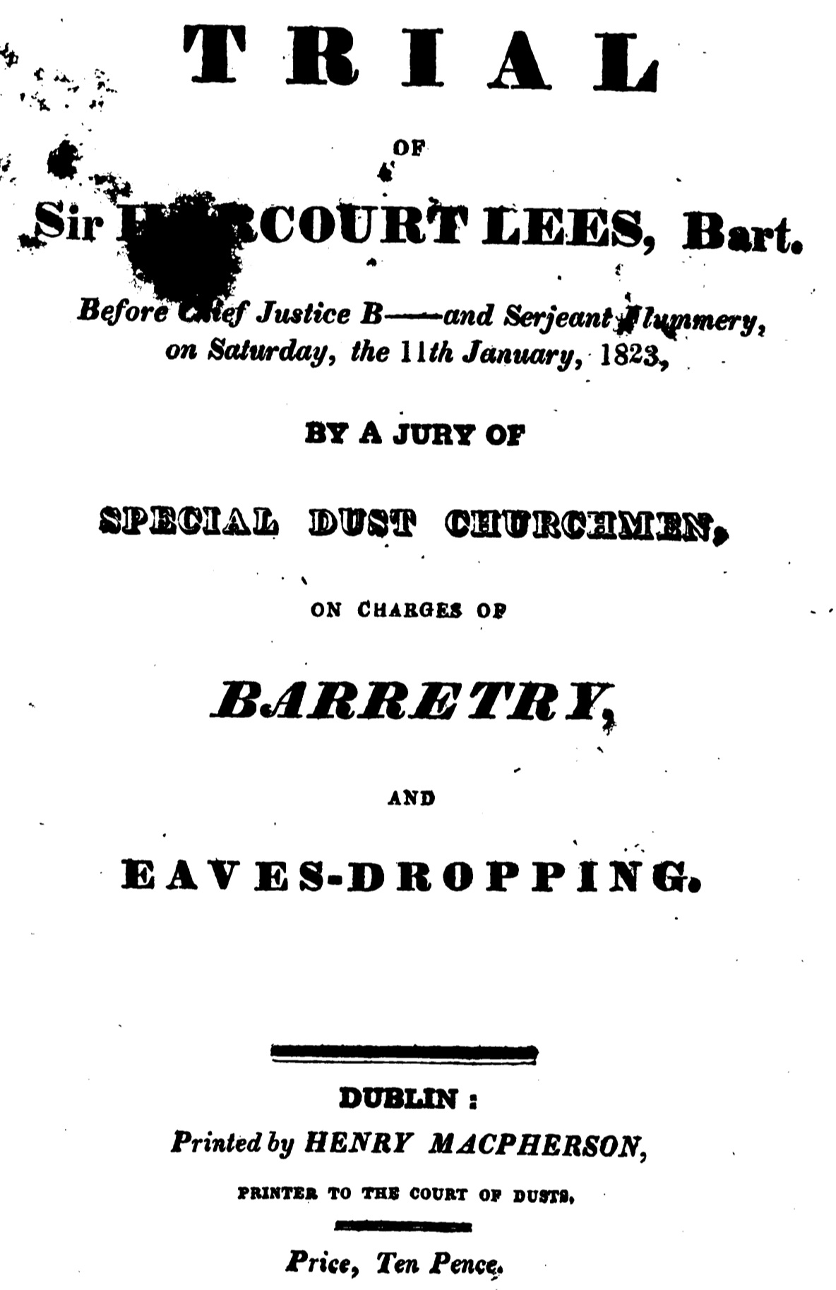 There is a fictitious account of a court appearance in January 1823 in which the Rev. Sir Harcourt Lees was accused of barretry (the vexatious stirring up of quarrels, fights or lawsuits) and eavesdropping. He was accused, amongst other things, of referring to the Catholics of Ireland as "vile papists, idolators, bloody papists, cut-throat papists, incendiaries, assassins". After retiring for "twenty seven minutes, three seconds and one quarter of a second" the jury returned a verdict of "guilty"1,2.
