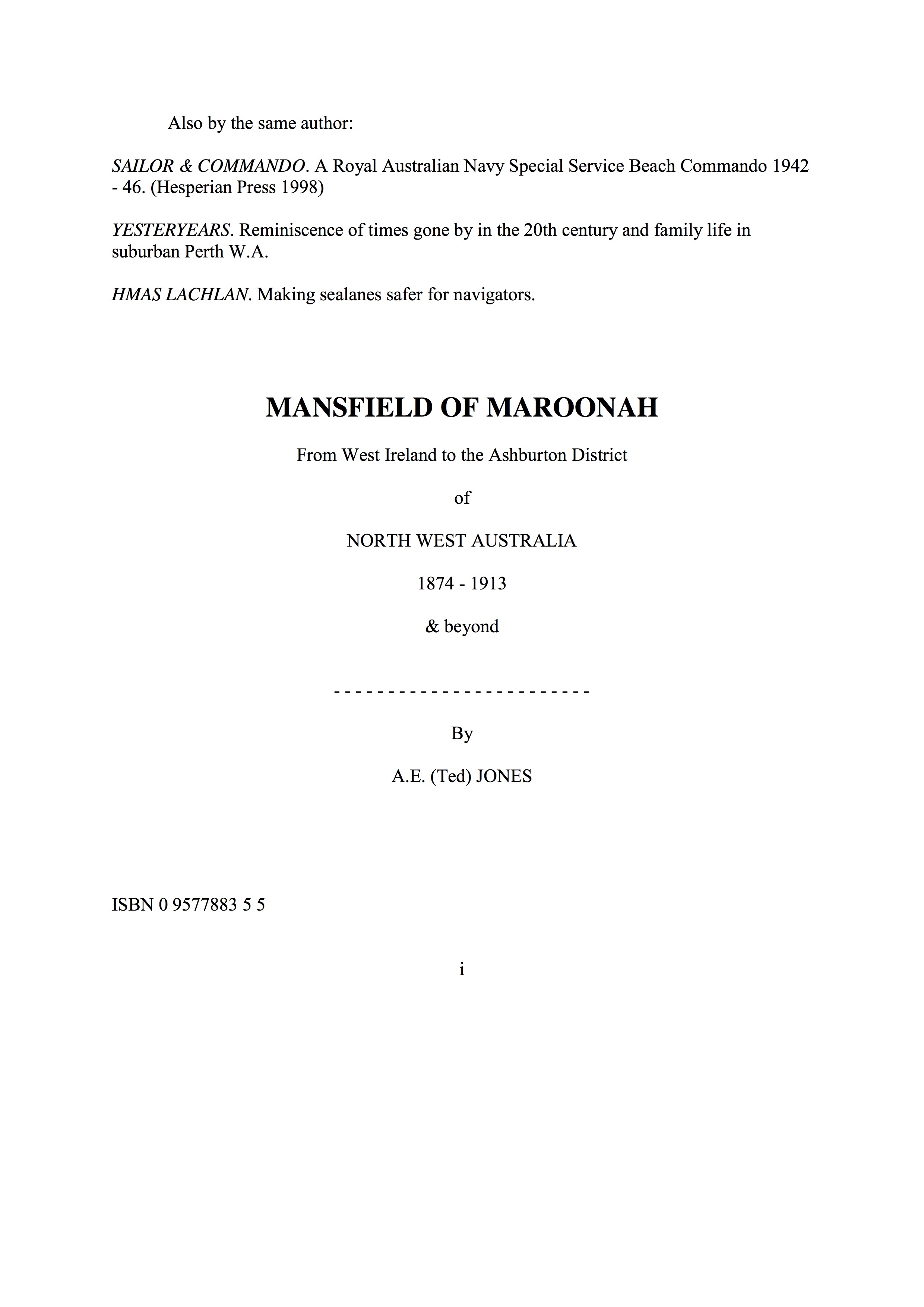 Mansfield of Maroonah: From West Ireland to the Ashburton District of North West Australia 1874-1913 and beyond. Bibra Lake, WA. ISBN 0957788355