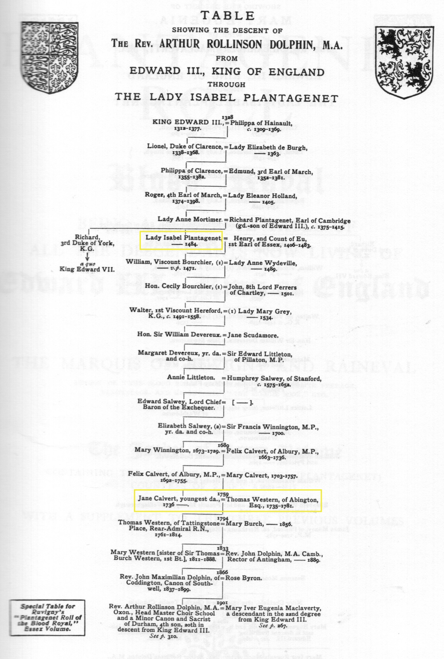 Plantagenet family tree (Edward III to Jane Calvert) from: The Plantagenet Roll of the Blood Royal (The Isabel of Essex Volume) The Genealogical Publishing Co. Ltd. London (click image to enlarge)